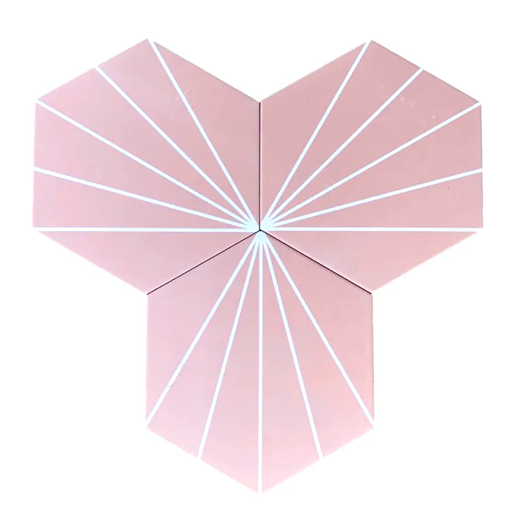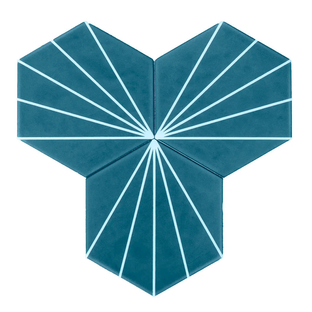 Ceramic Hex Tiles with an Art Deco Design that can be laid in multiple ways to create an array of different patterns.